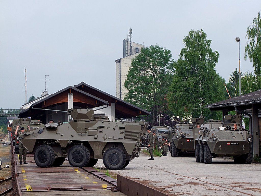 PANDUR 02007-R wird auf einen Flachwagen der Gattung Laads eingewiesen;110613