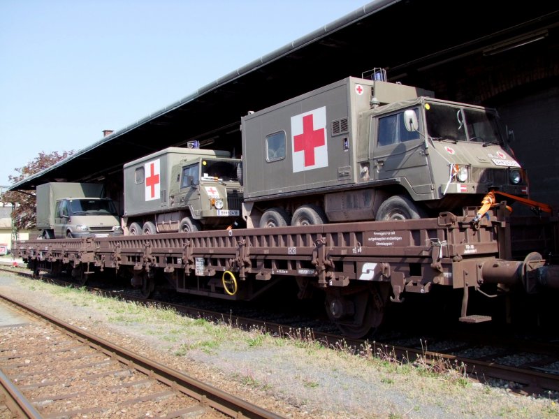 2 "SanKa´s" (Sanitäts-Kraftfahrzeug) verladen auf Flachwagen der Gattung Laads; 090503