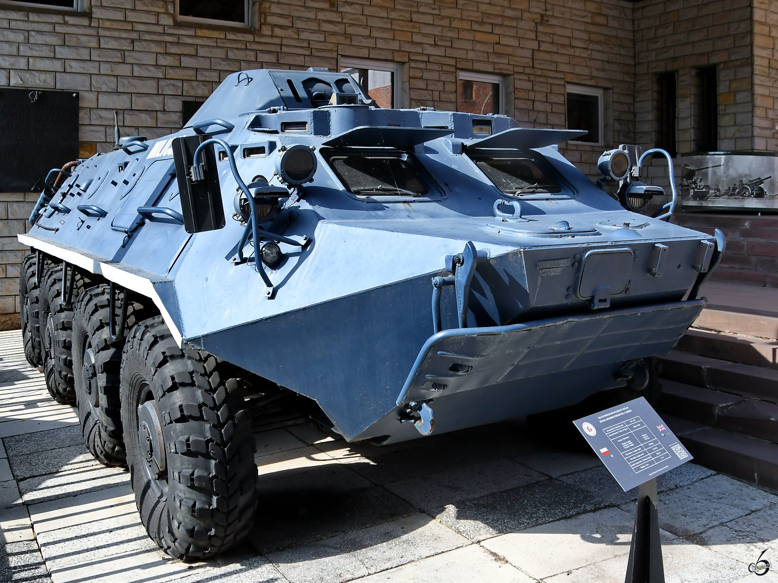 Dieser Schützenpanzerwagen BTR-60 PB hat das Farbkleid der Milicja Obywatelska, was von 1944 bis 1990 der offizielle Name der Polizei in Polen war. (Waffenmuseum Kołobrzg (Kolberg), September 2024)