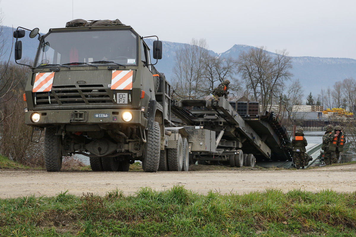 Steyr 1491 310/S 37 6 x 6 Sattelschlepper 95 mit Brückenmodul im Dienste des Pontonier Bataillons 26 am 15. März 2018 bei Arch.