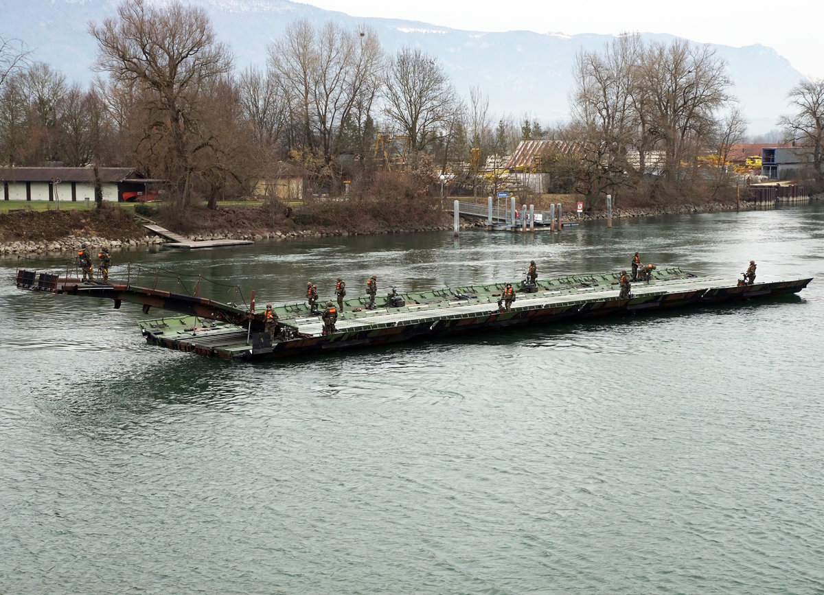 Nach der erfolgten Einwässerung fährt das Brückmodul in eigener Kraft zum Standort wo die Brücke gebaut wird.