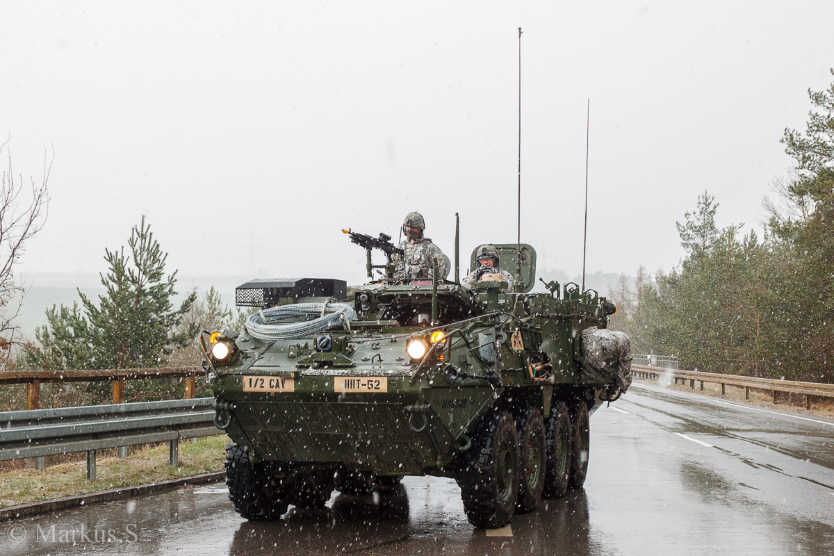 M1129 Stryker MC (Mortar Carrier) des 1/2CAV 1st Squadron 2nd Stryker Cavalry "War Eagle" (HHT "Mustangs") der U.S.ARMY. Konnte ich zwischen dem Gewerbegebiet Theuern und Ensdorf, am 01.April 2015 fotografieren.