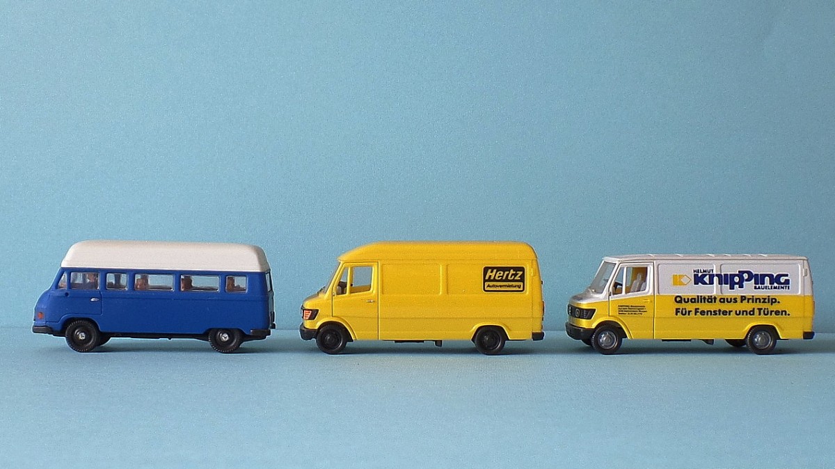 Seitensichten von links: MB L 206 (Bausatz Froewis) / MB 207 D (Hertz) Herpa / MB 207 D (Knipping) Herpa / 1:87, Foto am 8.4.2014