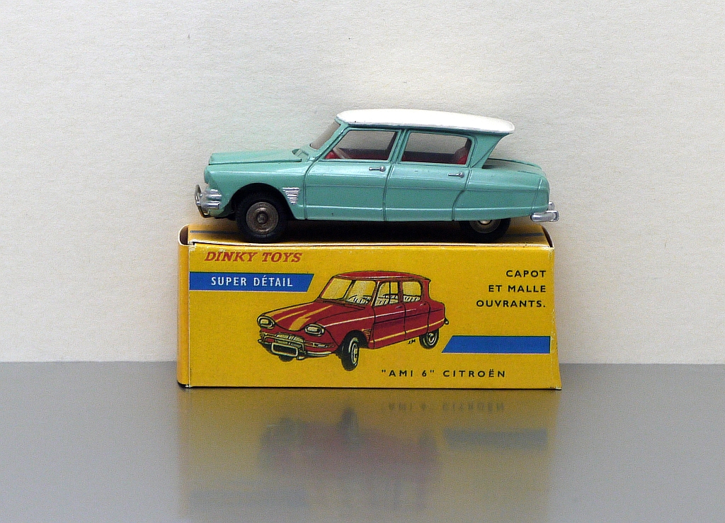 Originaler - und restaurierter - Citroen-Ami von DINKY TOYS auf Replikakarton. Fotografiert im Mai 2013.