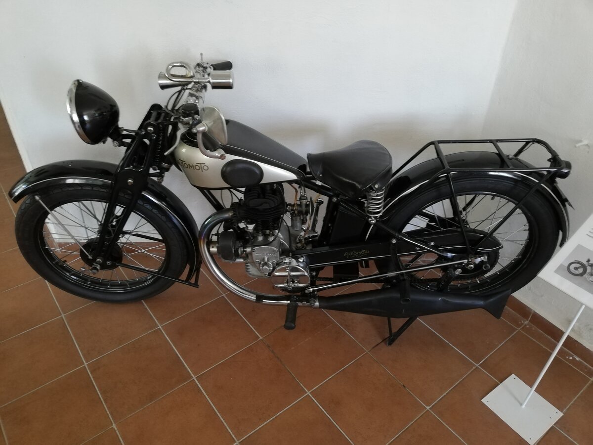 Automoto Typ A14 ist ein französisches Motorrad aus dem Jahr 1930. Es ist eine 4-Takt-Maschine mit 3-Getriebe. Der Zylinder hat 200 ccm. Das Motorrad ist kettengetrieben und hat eine elektrische Beleuchtung. Die Höchstgeschwindigkeit beträgt 60 km/h. Motomuseum Železná Ruda am 12. 7. 2021.