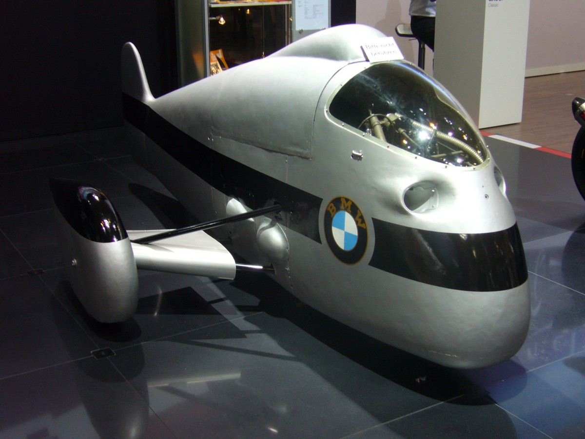 BMW 500 cm³ Weltrekordgespann von 1955. Mit diesem Gespann stellte Wilhelm Noll am 05.10.1955 den absoluten Geschwindigkeitsrekord für Motorradgespanne auf. Auf der Autobahn München/Ingolstadt erreichte er eine Spitzengeschwindigkeit von 280,2 km/h. Der Boxermotor mit zwei Zylindern leistet 75 PS aus 498 cm³ Hubraum. Techno Classica am 18.04.2015.