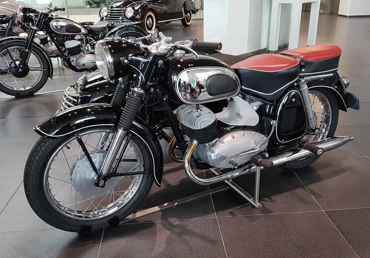 =DKW RT 350 S mit Binder-Seitenwagen, Bj. 1956, 348 ccm, 18,5 PS, gesehen im Audi-Museum Ingolstadt im April 2019.