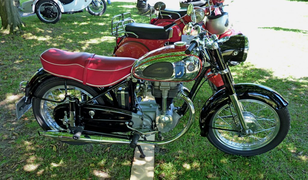 Horex Regina 350. Die Horex-Werke im hessischen Bad Homburg hatten mit der "Regina", die serienmäßig mit einer Teleskopgabel und Leichtmetalltrommelbremsen ausgerüstet war, Anfang der 1950´er Jahre einen absoluten Verkaufsschlager im Programm. Von 1952 bis 1954 wurden über 50.000 Stück von der 350´er hergestellt. Damit war die Maschine weltweit das meistverkaufte Motorrad in dieser Klasse. Der Einzylinderviertaktmotor hat einen Hubraum von 342 cm³ und leistet 19 PS. Die "Regina" war auch als 250´er und 400´er lieferbar. Doch schon 1956 endete die Produktion. Niemand wollte mehr so recht auf ein Motorrad steigen. Oft reichte das Geld schon für einen VW Käfer, ein richtiges Auto mit Dach und Platz für die ganze Familie. Zylinderhaus Bernkastel-Kues am 27.05.2025.