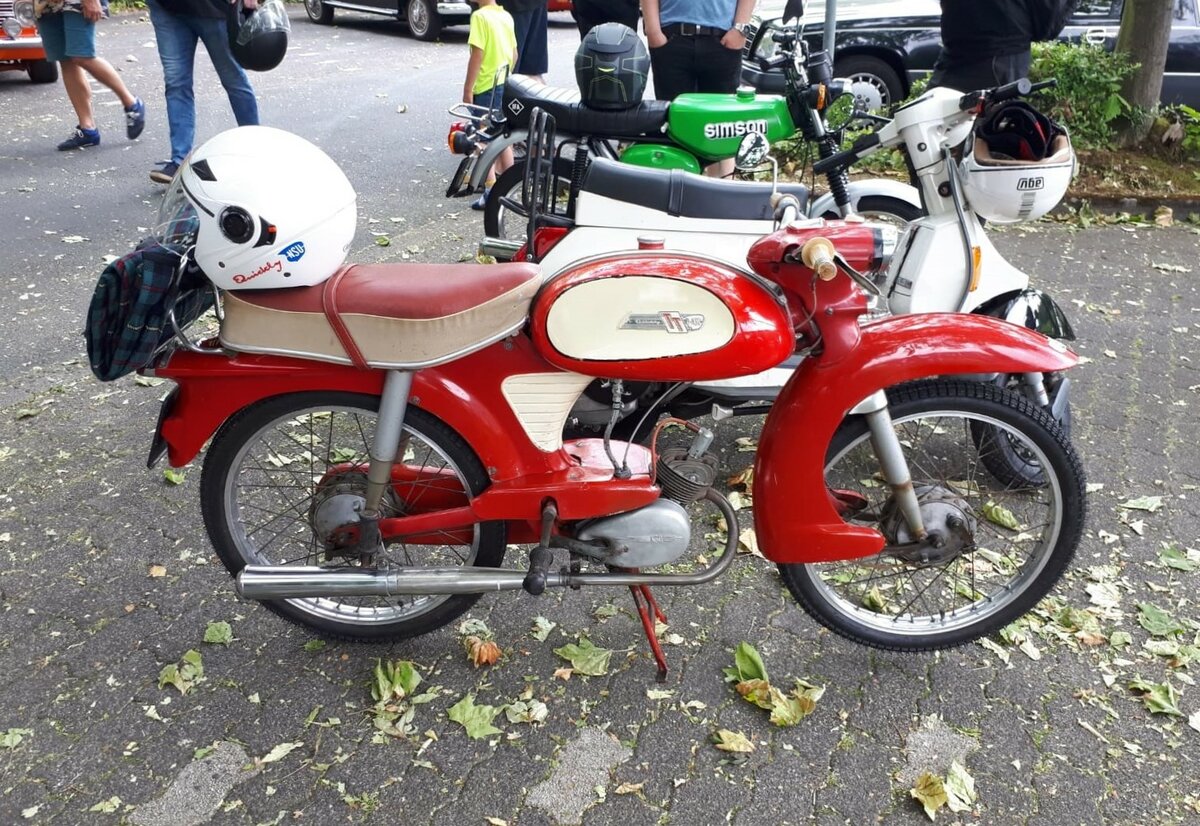 NSU Quickly TT, gebaut von 1959 bis 1963. Das Erfolgsmodell "NSU Quickly" kam 1953 auf den Markt. Im Laufe der 14-jährigen Produktionszeit dieses Moped´s gab es etliche Modellversionen der "Quickly". Eine Version war die abgelichtete "Quickly TT" die sich während der fünfjährigen Produktionszeit 23.952 mal verkaufte. Das sportlich anmutende Modell war nur in der Farbkombination Alfarot/Callaweiß lieferbar und kostete durchgängig DM 812,00. Der fahrtwindgekühlte Einzylinderzweitaktmotor hat einen Hubraum von 49,8 cm³ und leistet 1,7 PS. Oldtimertreffen in Siegen am 19.06.2022.