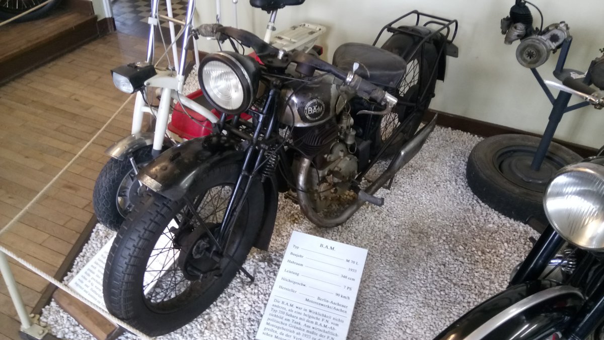 B.A.M. M70L von 1933. Dieses Motorrad der B.A.M. (Berlin-Aachener-Motorenwerke in Aachen) ist in Wirklichkeit nichts anderes, als eine belgische F.N. 350 Sahara mit dem B.A.M. Logo auf dem Tank. Aus wirtschaftspolitischen Gründen mußte der F.N. Montagebetrieb in Aachen ab 1933 zu dieser List greifen, da unter der damaligen Herrschaft des Regimes der Verkauf von ausländischen Produkten erschwert wurde. Motorradmuseum Ibbenbüren am 08.04.2017.