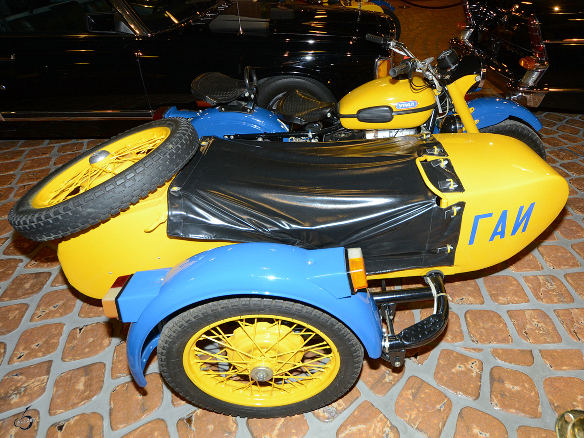 Ein Ural Motorrad mit Beiwagen im Farbton der Verkehrspolizei (GAI) im Technikmuseum Vadim Zadorozhny (Moskau, Mai 2016)