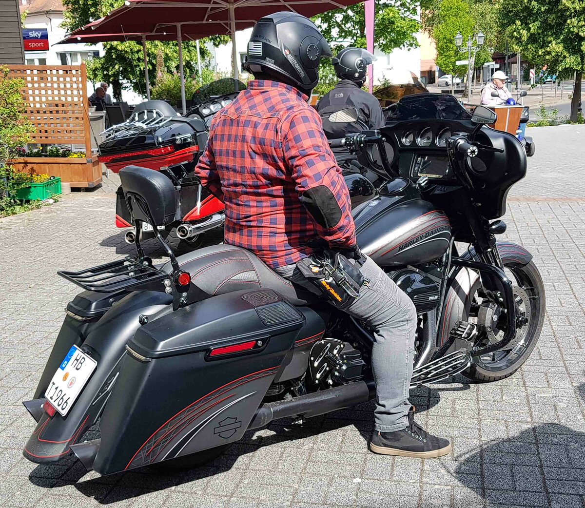 =Harley Davidson steht abfahrbereit zur geführten Tour vom Konrad-Zuse-Hotel in Hünfeld, 07-2023
