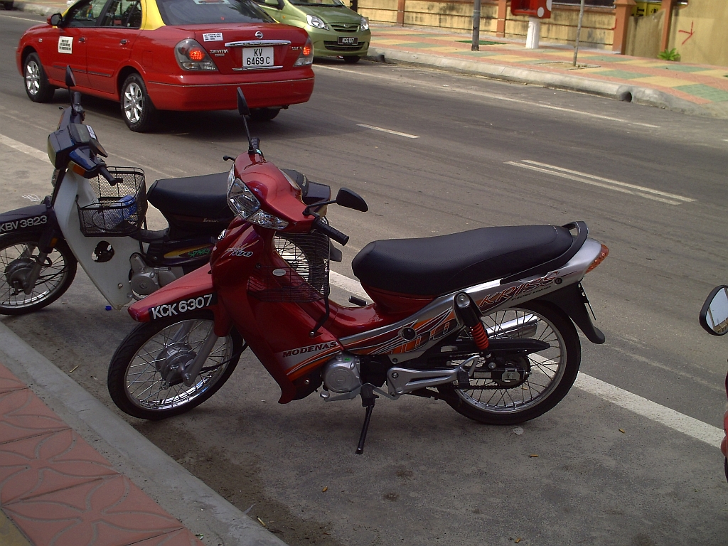 Meine KRIS 100 Modenas am 24.Mai 2009 nach der Mietrückgabe in Pantai Chenang auf der Insel Langkawi / Malaysia. Die Marke KRIS ist der malaisische Linzenbau der Honda Dream, Hubraum 100ccm.