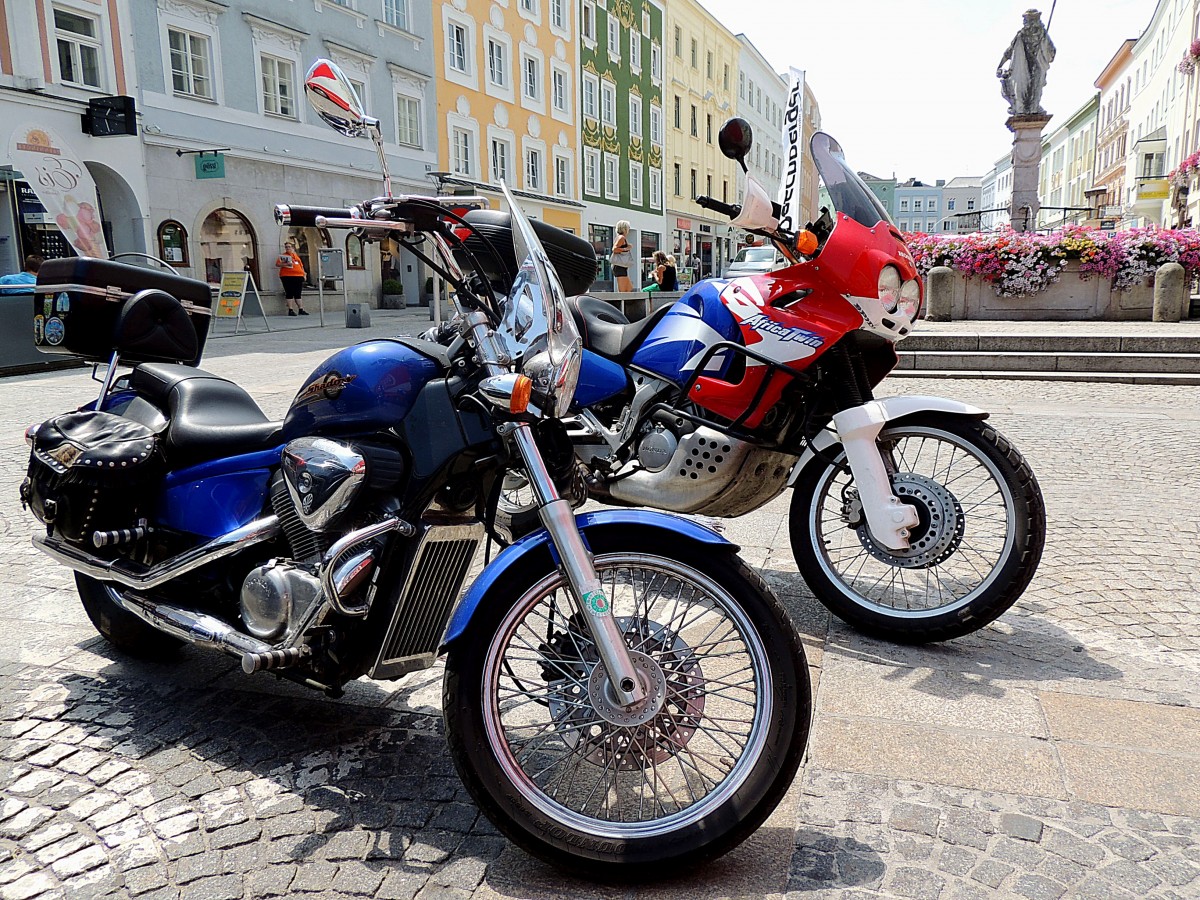 HONDA-Shadow und HONDA Africa-Twin, am unteren Hauptplatz von Ried; 130724