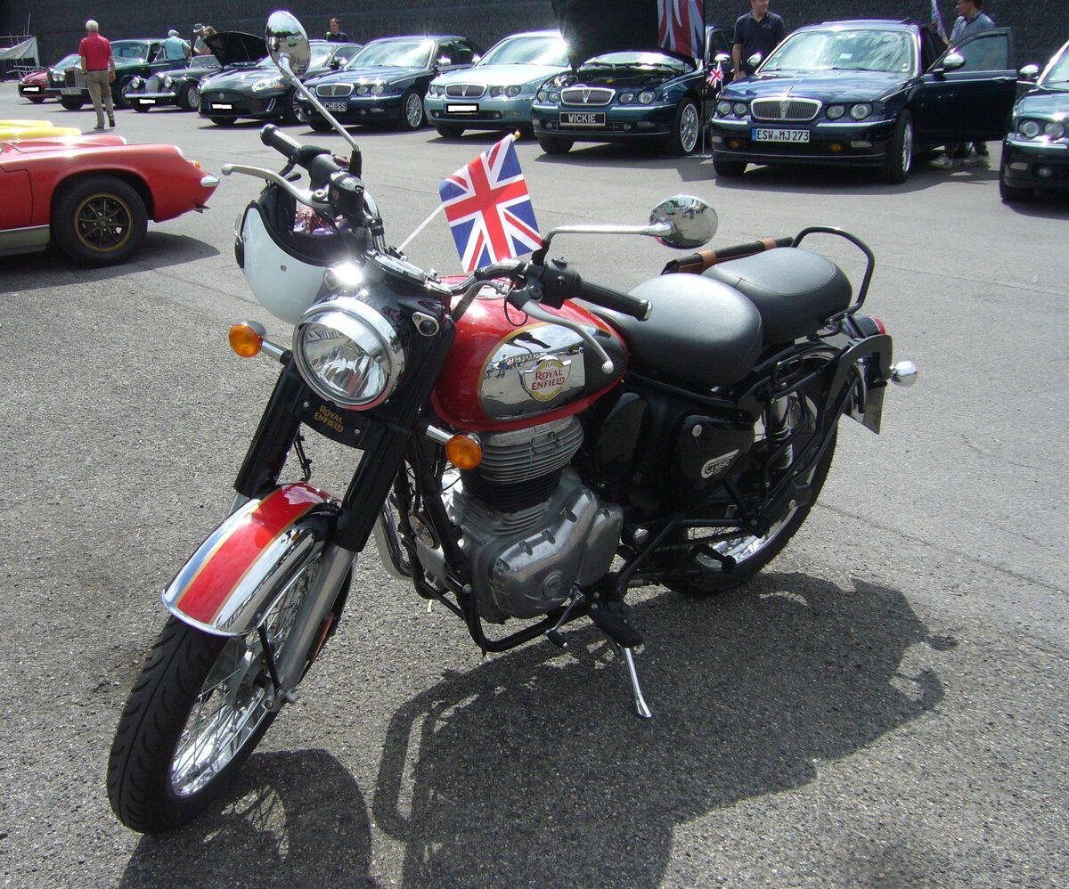 Royal Enfield 350 Classic. Das Modell Classic 350 geht auf die Royal Enfield G2 aus dem Jahr 1950 zurück. Seitdem ist ihre perfekt proportionierte Silhouette nie aus der Mode gekommen. Der stehende Einzylindermotor hat einen Hubraum von 349 cm³ und leistet gemäß Werksangabe 20,2 PS. British Car and Motorcycle Meeting am 20.07.2025 an Mo´s Bikertreff in Krefeld.