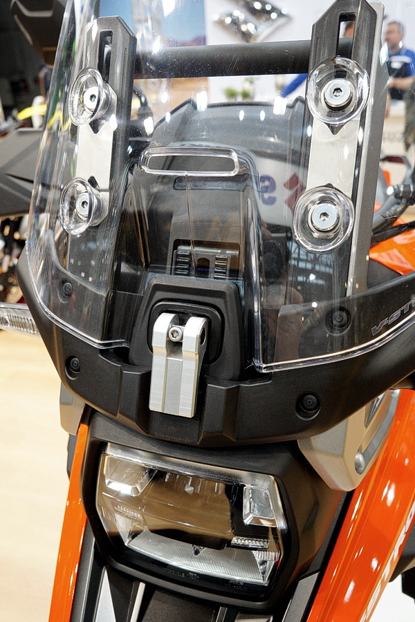Pfiffige Lösung einer Verstellvorrichtung für ein Windschild an einer Suzuki V-Strom 1050XT. Flüssigkeitsgekühlter-Zweizylinder V2-Motor mit 107PS (79kW) bei 8500U/min. Foto: BMT (Berliner Motorrad Tage) Febr. 2020