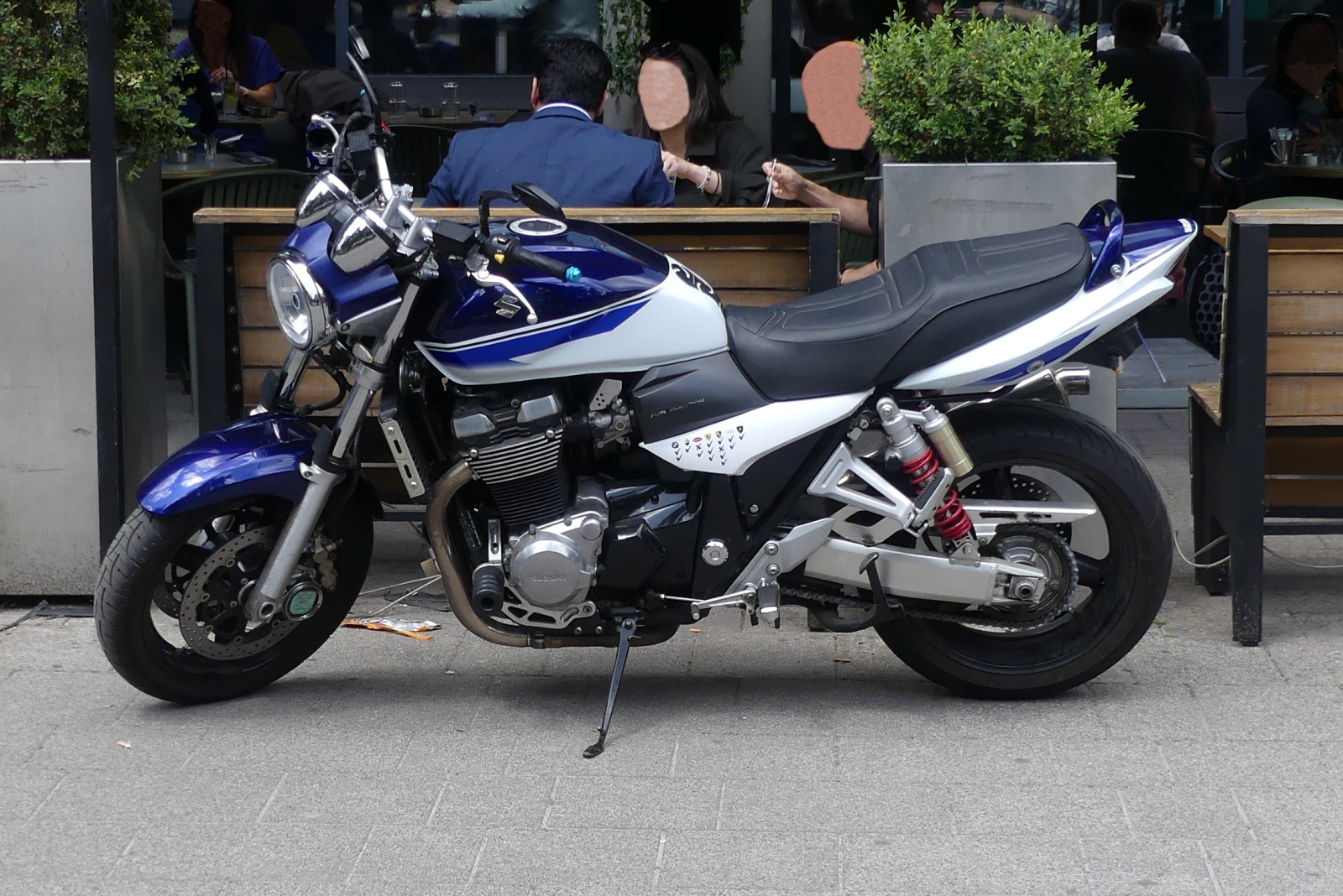Suzuki Motorrad, abgestellt nahe einer Terasse. 06.2024
