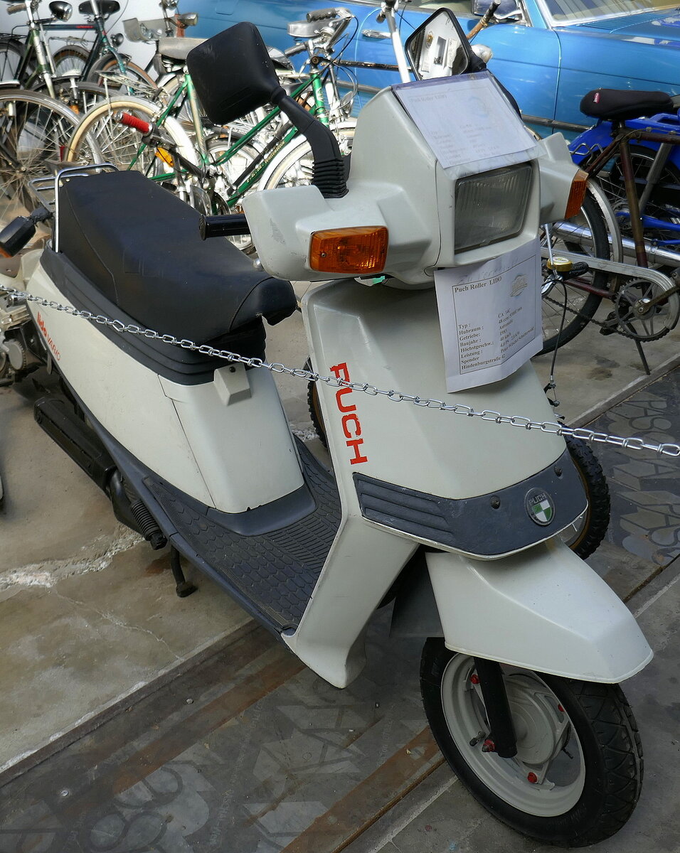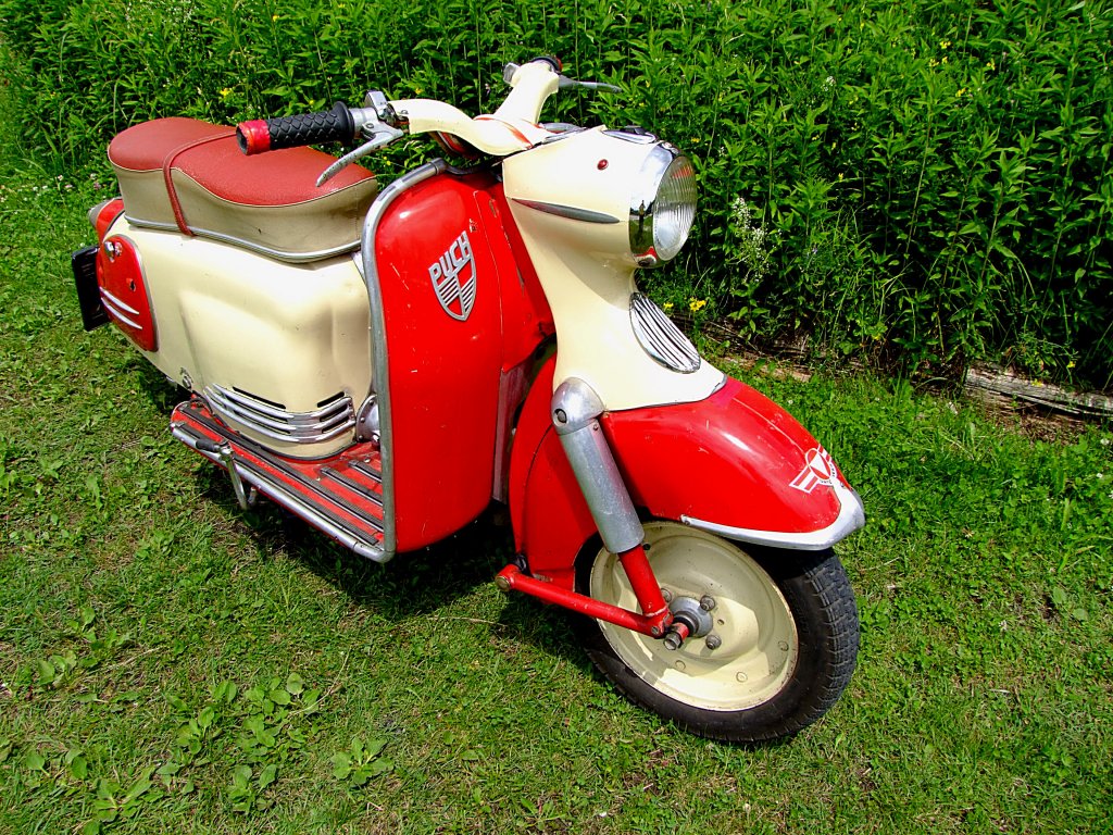 Puch SR 150 Roller. Im Jahr 1958 brachte die Steyr-Daimler-Puch AG aus Graz das Nachfolgemodell der erfolgreichen Motorroller-Baureihe RL auf den Markt. Der neue Roller trug die Bezeichnung SR und war als als 125´er und 150´er lieferbar. Von 1958 bis 1968 konnten die Grazer etwas über 35.000 solcher Motorroller absetzen. Der hier gezeigte Roller ist ein 150`er. Der Hubraum des Einzylinderzweitaktmotors beträgt genau 147 cm³ und leistet 6 PS. Die Höchstgeschwindigkeit wurde mit 90 km/h angegeben. Zylinderhaus Bernkastel-Kues am 27.05.2025. Michael H.