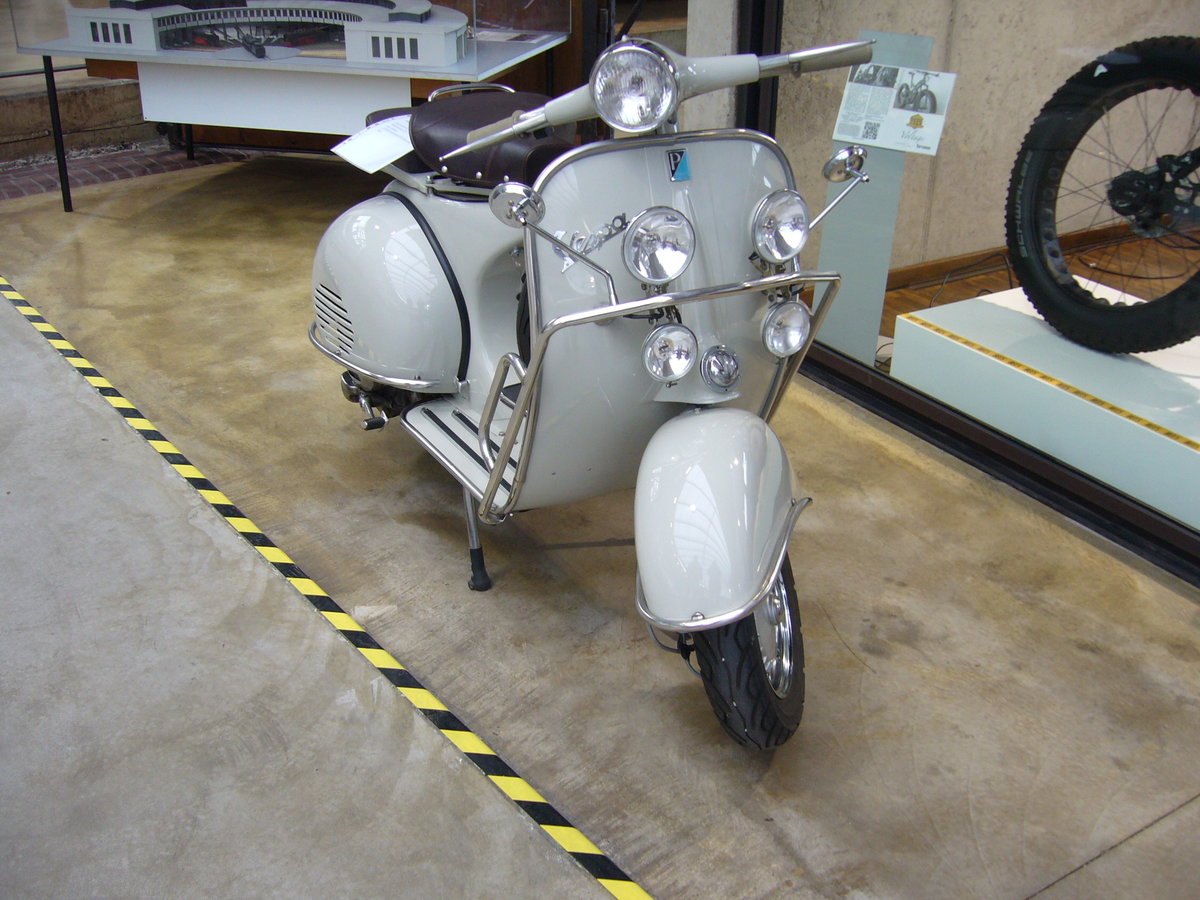 Vespa 150 aus dem Jahr 1966. Der 1-Zylinderzweitaktmotor hat einen Hubraum von 151 cm³ und leistet 6,8 PS. Classic Remise Düsseldorf am 19.12.2017.