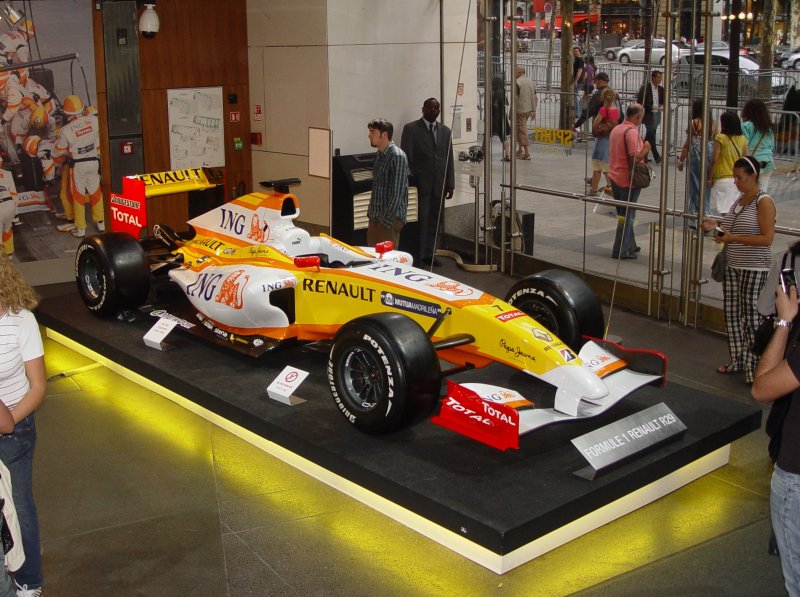 In den Verkaufs- und Ausstellungsräumen von Renault in Paris auf den Champs-Elysées war am 13.07.2009 auch dieser aktuelle Formel 1 Rennwagen R29 ausgestellt: V 8 Motor mit 2400 ccm.