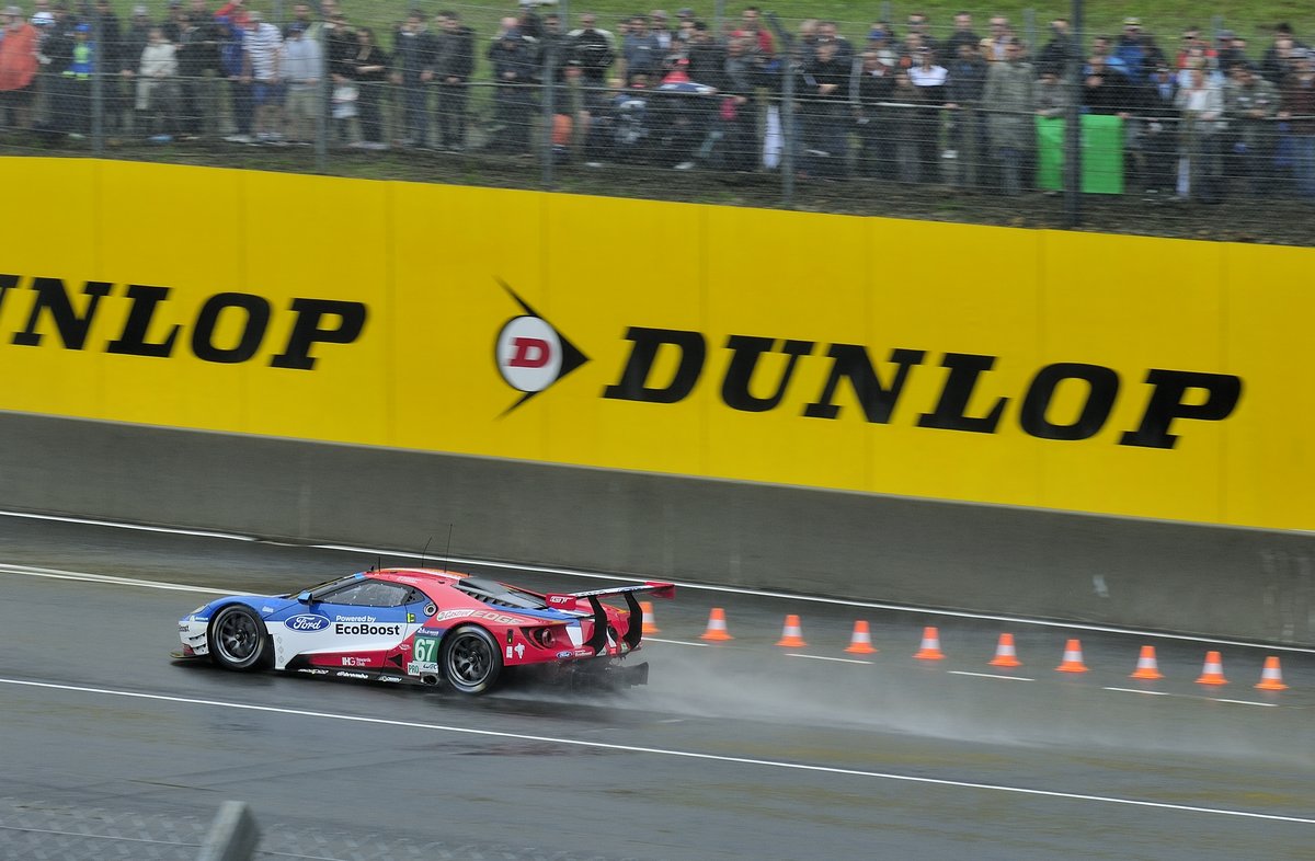 GTLM Pro (Gran Turismo Le Mans), Nr. 67 Ford GT vom Ford Chip Ganassi Team UK, im Starkregen auf der Start & Tielgeraden, wärend der 84. 24h Le Monde am 18.6.2016