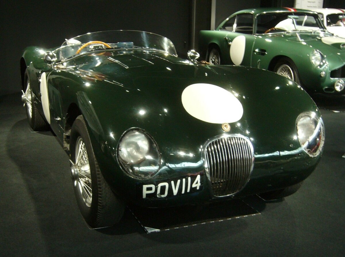 Jaguar C Type von 1953. Dieser Jaguar C Type wurde beim 24 Stunden Rennen von LeMans im Jahr 1953 vom belgischen Rennteam Ecurie Francorchamps mit den beiden belgischen Rennfahrern Roger Olivier Antoine Fernand Laurent (*1913 +1997) und Charles Victor Raymond André Evance de Tornaco (*1927 *1953 bei einem Rennunfall in Modena/Italien) eingesetzt. Das Team erreichte Platz neun im Gesamtklassement. Der Sechszylinderreihenmotor hat einen Hubraum von 3442 cm³ und leistet genau 200 PS. Im Rennen wurden Geschwindigkeit bis zu 232 km/h gemessen. Der Wagen befindet sich in einem unrestaurierten Originalzustand. Nationales Automuseum/Loh Collection am 08.11.2023.
