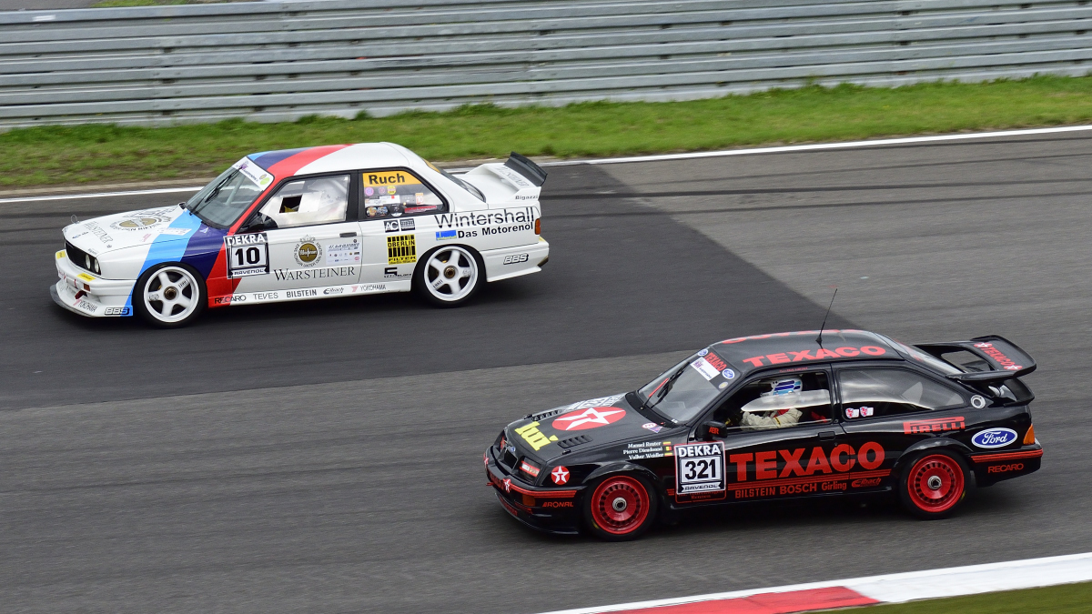 #10 BMW E30 M3 DTM (1989)und 321 Ford Sierra RS 500 (1989). Qualifying zum Rennen 10, Tourenwagen Classic 47. AvD-Oldtimer-Grand-Prix 2019, Samstag 10.08.2019 von der Zuschauertribühne.