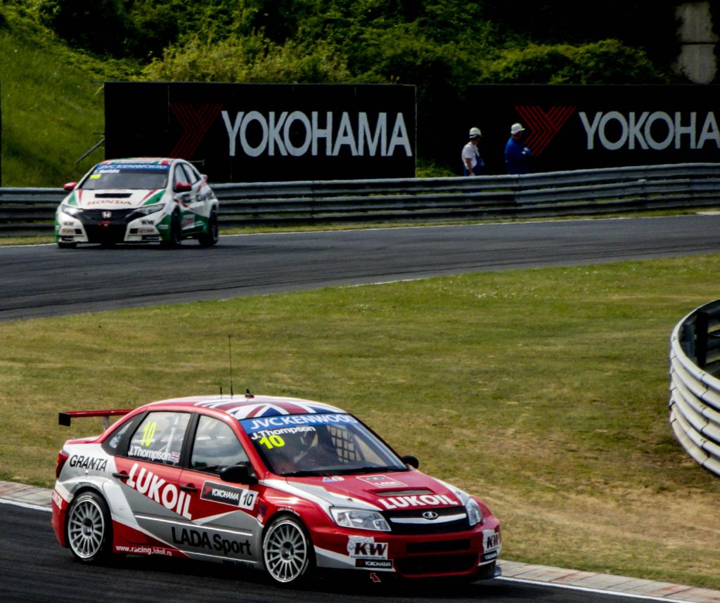 Lada Granta (J. Thompson) gefolgt von einem Honda Civic (T. Monteiro). WTCC Rennen am 05.05.2013 auf dem Hungaroring.