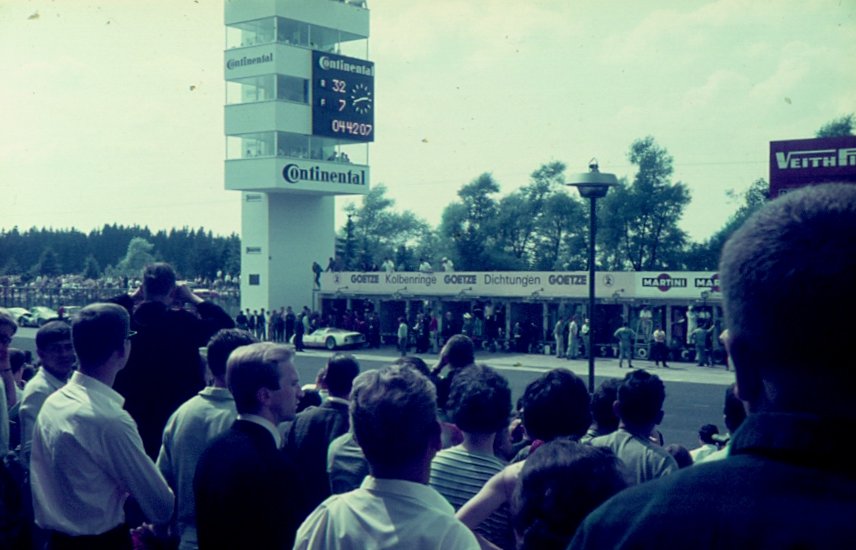Nürburgring 1000 km-Rennen 1966: Der Tower und die Boxen der Fahrzeuge an Start und Ziel der alten Nürburgring Nordschleife.