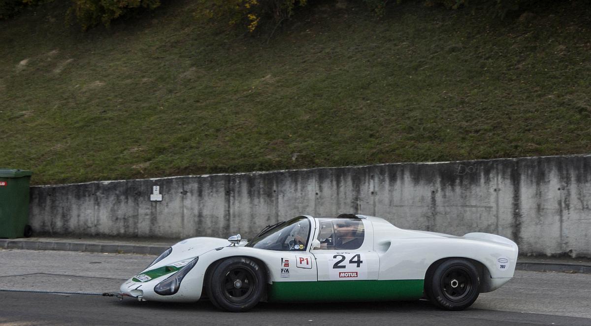 Seitenansicht: Porsche 910 Endurance Rennauto, fotografiert auf der Hungaroring Classic am 01.10.2017.