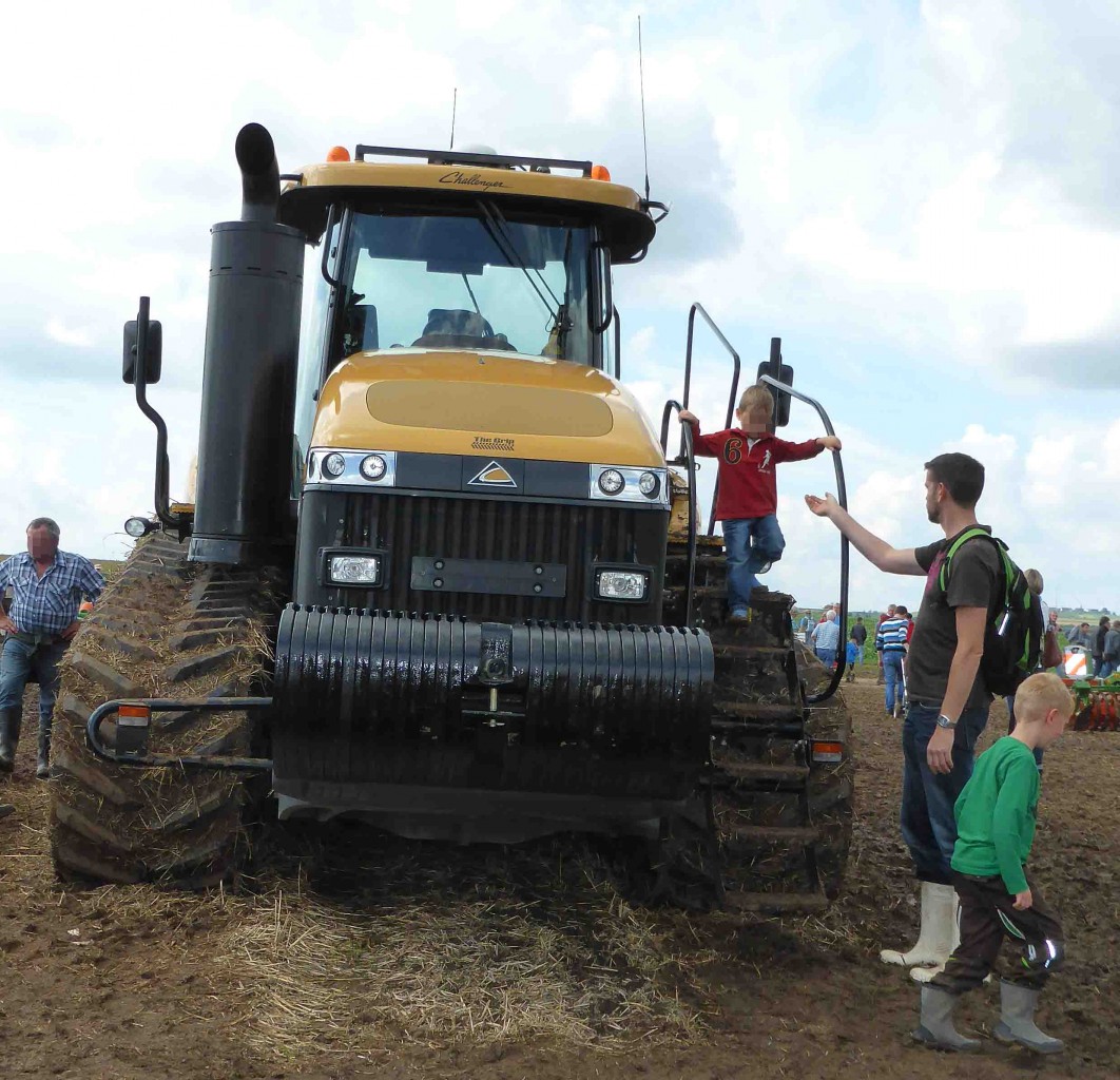 Challenger MT 875 E, gesehen beim FENDT-Feldtag in Wadenbrunn. Der Raupentraktorhersteller gehört wie die Firma Fendt zum ACCO-Konzern. Das ausgestellte Fahrzeug hat einen Hubraum von 16,8 l, einen 12 Zylindermotor der 590 PS leistet.