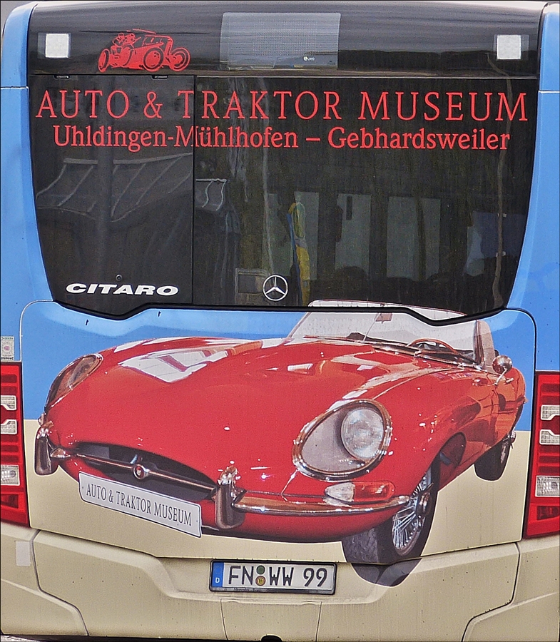. Werbung am Heck des Shuttle Busses welcher im Stundentakt vom Bahnhof Uhldingen – Mühlhofen zum Auto und Traktor Museum in Gebhardsweiler und anderen Ausstellungen fährt. 07.09.2017
