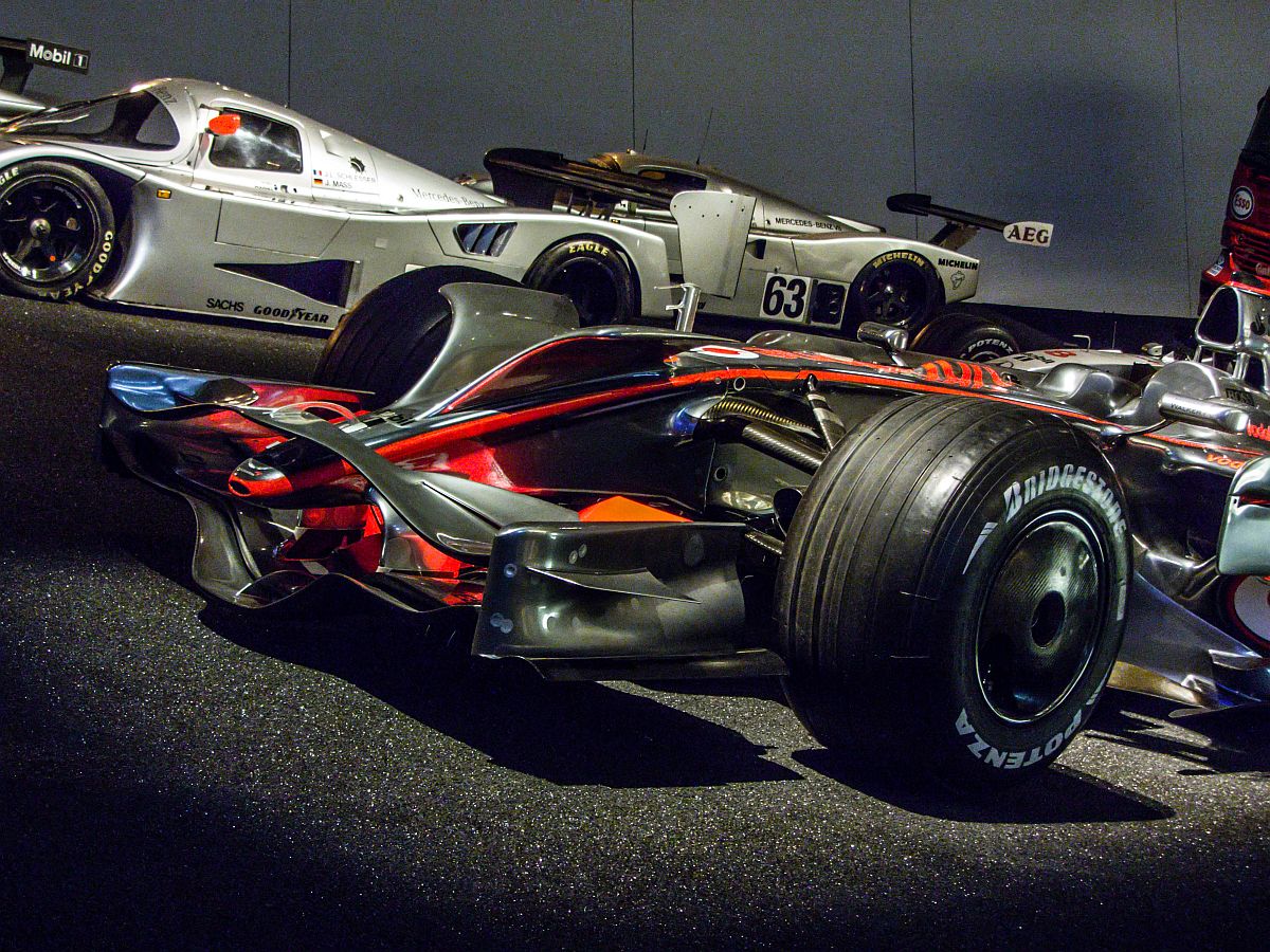 McLaren-Mercedes MP4-23 (Detailaufnahme), Weltmeisterwagen von Hamilton, 2008. Mercedes-Benz Museum am 30.11.2013.