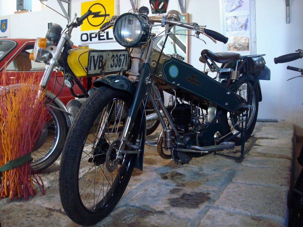 Hoco, gebaut von der Firma Hochmair in Minden/Westf. 1-Zyl.JAP-Motor mit 300ccm und 4,5PS, Besonderheit:der Hauptrahmen bestand aus Holz, Oldtimer-Museum Meßkirch, Aug.2010
