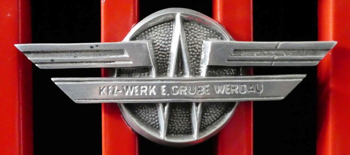Kühleremblem der Firma Grube - Werdau, gesehen im sächsischen Nutzfahrzeugmuseum in Hartmannsdorf im Juli 2016