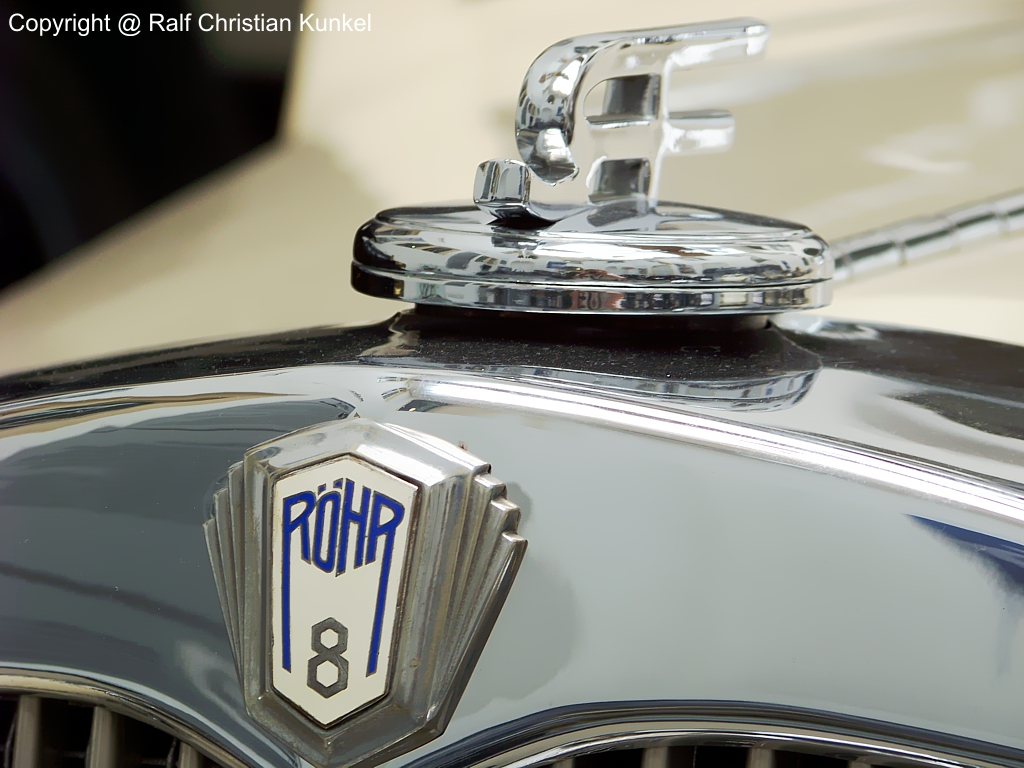 Logo Röhr 8 - stammt vom Röhr 8 Typ F Cabriolet mit der Karosserie von Gläser/Dresden - Baujahr 1933, Hersteller: Neue Röhr AG, Ober-Ramstadt in Hessen, Deutschland - Zirka 3.500 Röhr-Automobile wurden zwischen 1927 und 1935 gebaut, ca. 250 Stück davon vom Typ F - Das abgebildete Fahrzeug hat folgende technische Daten: flüssigkeitsgekühlter 8-Zylinder-Viertakt-Ottomotor (Konstruktion des Typ F Motors von Ferdinand Porsche), Hubraum: 3.287 cm ³, Leistung: 55 kW (75 PS) bei 3.200 U/min, Einscheibentrockenkupplung, ZF-Aphon-Getriebe mit Schnellgang und Freilauf, 2. bis 4. Gang synchronisiert, L x B x H: 4.800 x 2.000 x 1.660 mm, Leergewicht: 1.580 kg, Vmax: 125 km/h - fotografiert am 08.05.2008 im Verkehrsmuseum Dresden - Copyright @ Ralf Christian Kunkel