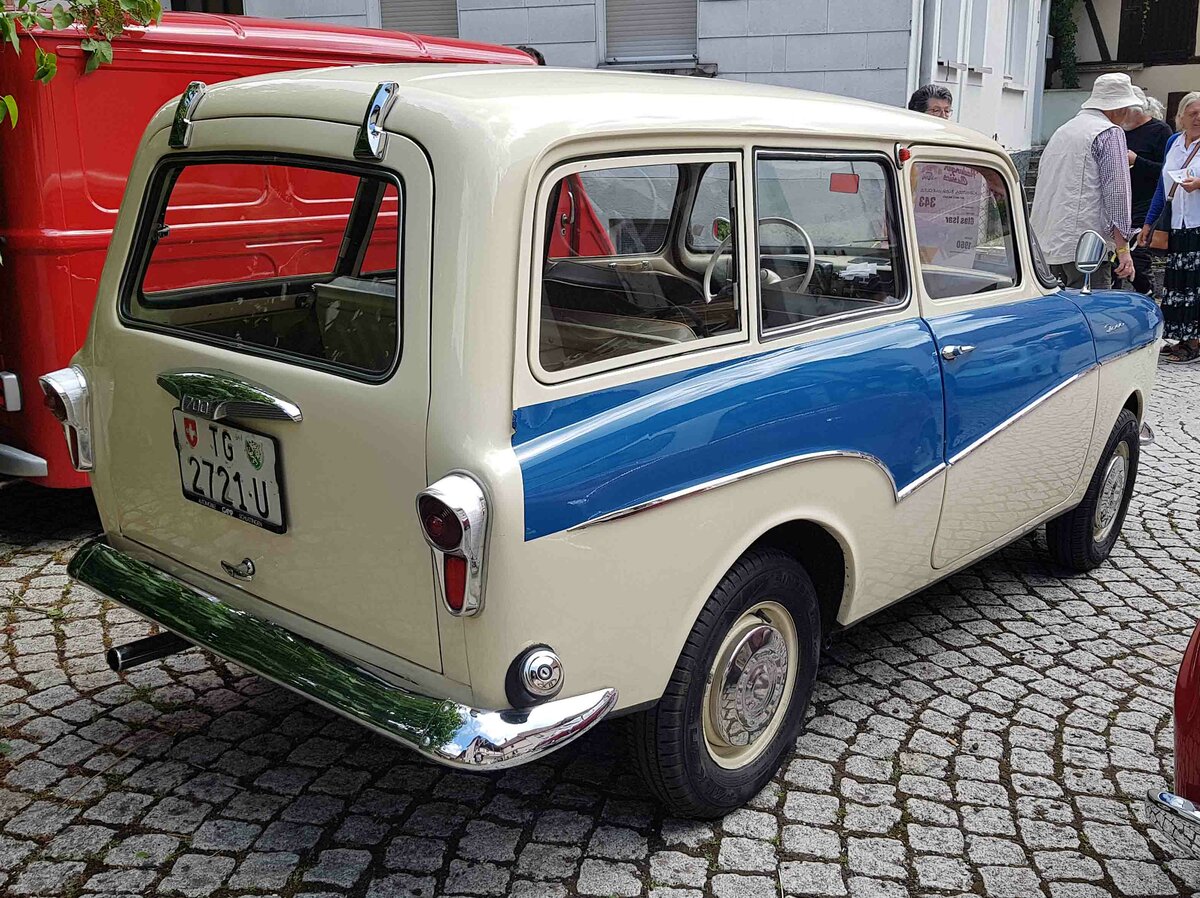 Glas Isar T600 im Farbton gordonblau, gebaut von 1957 bis 1965. Obwohl über 87.000 Fahrzeuge dieses Typs produziert wurden, sind heute nur noch ganz wenige Exemplare vorhanden. Mit diesem Modell wollte die Hans Glas GmbH in der unteren Mittelklasse Fuß fassen. Bei seiner Vorstellung nannte sich der Wagen noch Goggomobil 600. Das Modell hatte auch einen "großen" Bruder namens Glas T700. Die Modellreihe litt unter etlichen Kinderkrankheiten. Der Zweizylinderboxermotor des T600 hat einen Hubraum von 584 cm³ und leistet 19 PS. Zylinderhaus in Bernkastel-Kues am 23.05.2024.