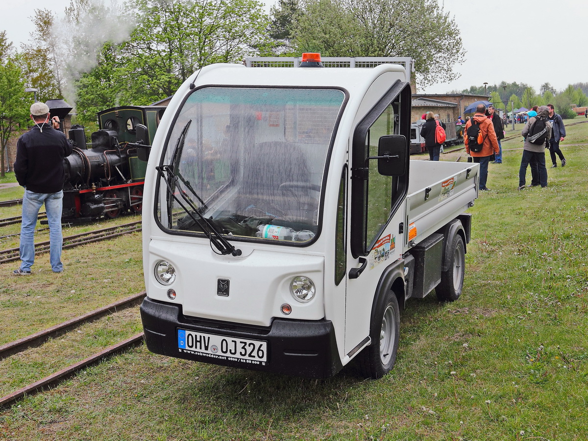 Goupil G3, elektrisches Nutzfahrzeug der Firma Goupil Industrie, Frankreich.mit einer Geschwindigkeit bis 40 km/h. Gesehen am 13. Mai 2017 im Ziegeleipark Mildenberg in der Uckermark.