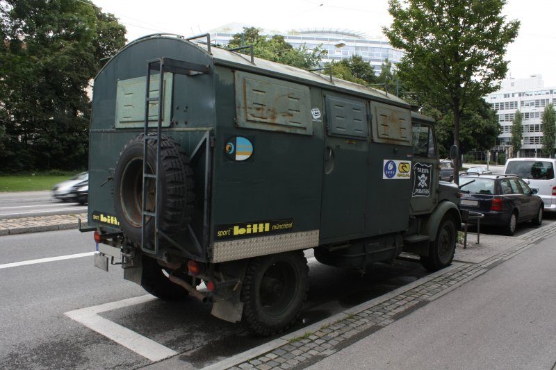 Heckansicht eines Hanomag AL 28 mit Kofferaufbau, welches wohl jetzt als Reise-/Expeditionsmobil genutzt wird. (Hattingen, Februar 2025)