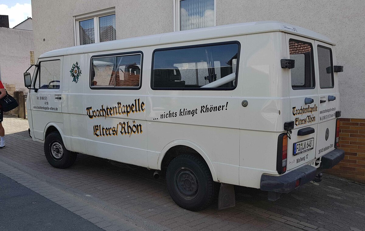 =VW LT der TRACHTENKAPELLE ELTERS steht im Mai 2022 beim Centmarkt in Hofbieber