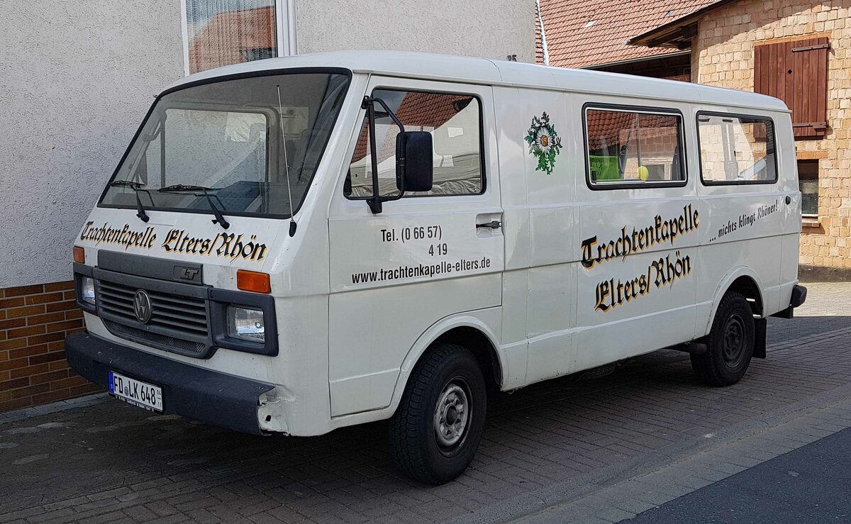 =VW LT der TRACHTENKAPELLE ELTERS steht im Mai 2022 beim Centmarkt in Hofbieber
