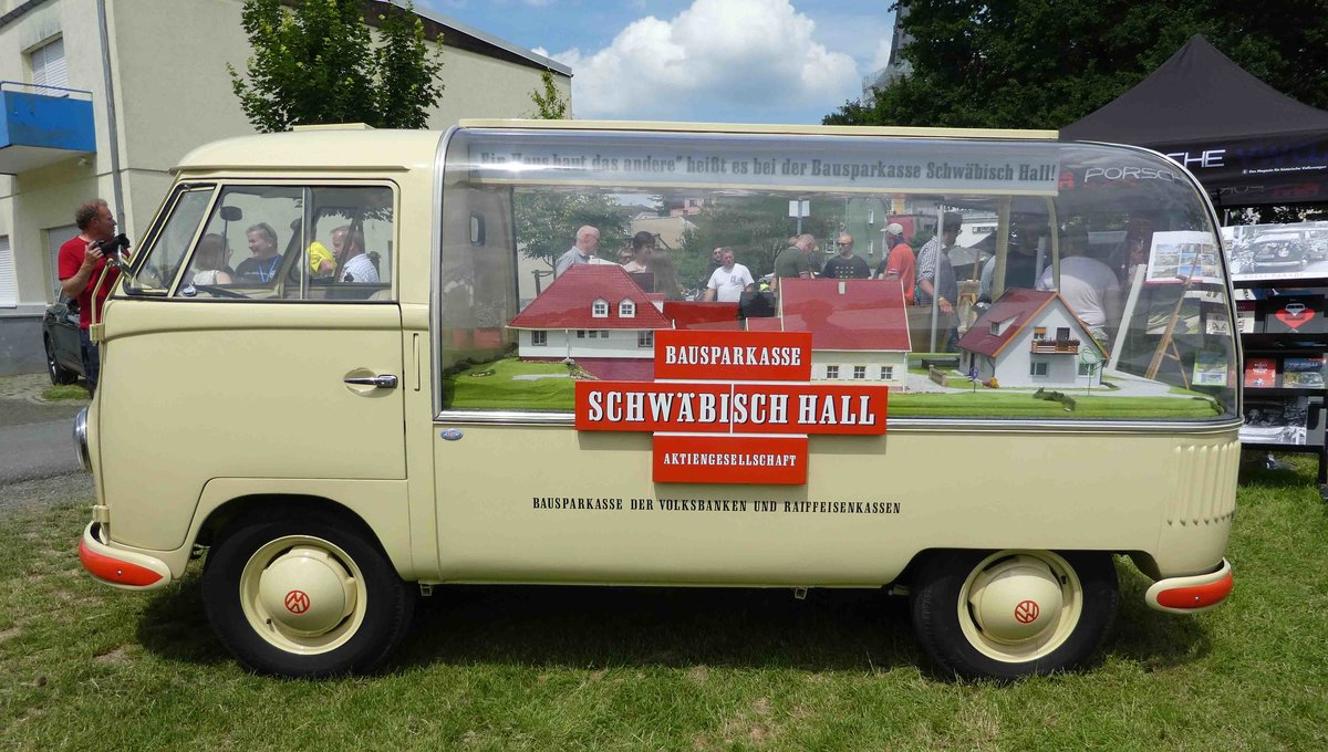 =VW T 1 "Schneewittchensarg", ein Werbefahrzeug von Schwäbisch Hall aus dem Jahr 1959, steht auf dem Ausstellungsgelände in Bad Camberg anl. LOTTERMANN-Bullitreffen im Juni 2019