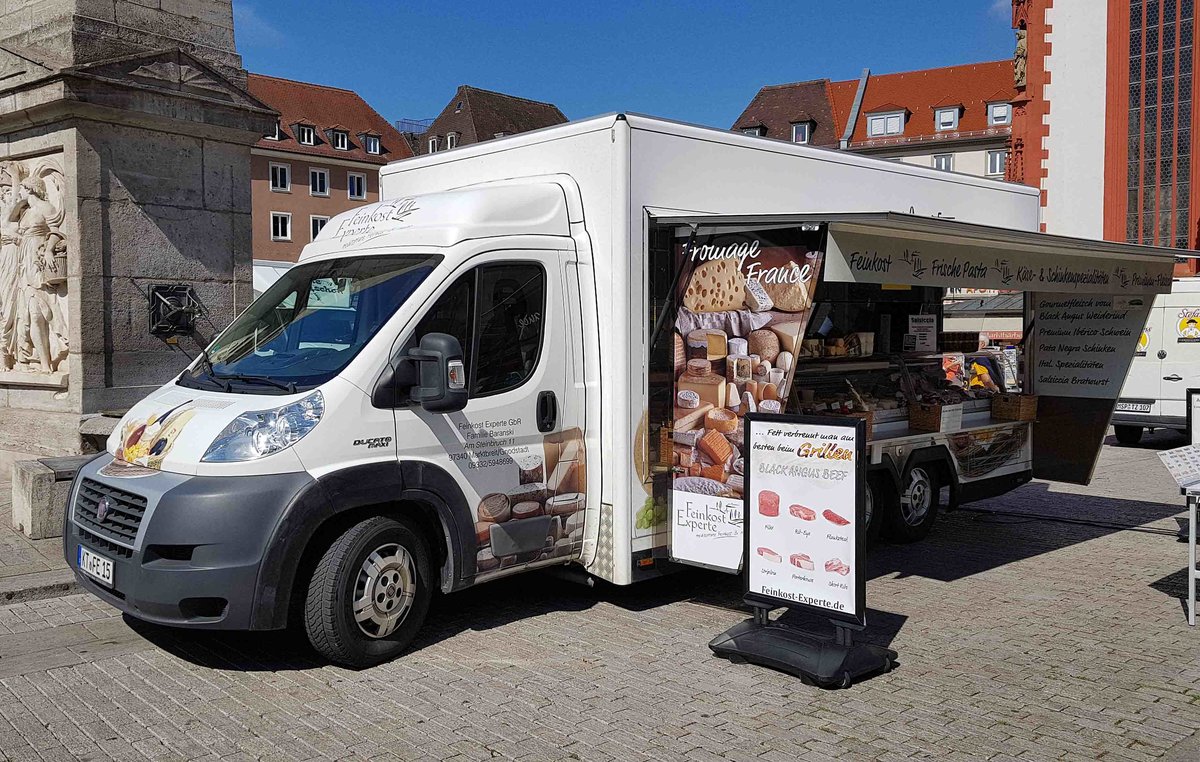 =Fiat Ducato von Feinkost BARANSKI steht auf dem Marktplatz in Würzburg, 09-2020