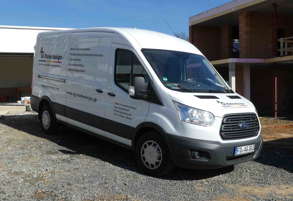 =Ford Transit von "AG Malerdesign" steht im März 2019 auf einer Baustelle in Petersberg-Marbach