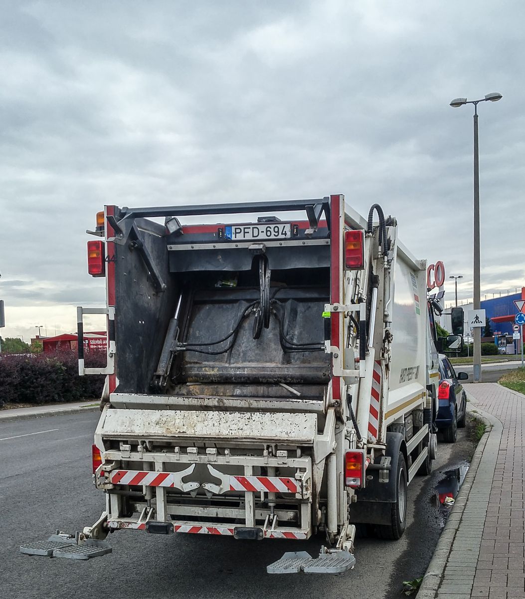 Rückansicht:Mitsubishi Fuso Canter Mülltransportwagen. Foto: Mai, 2020.