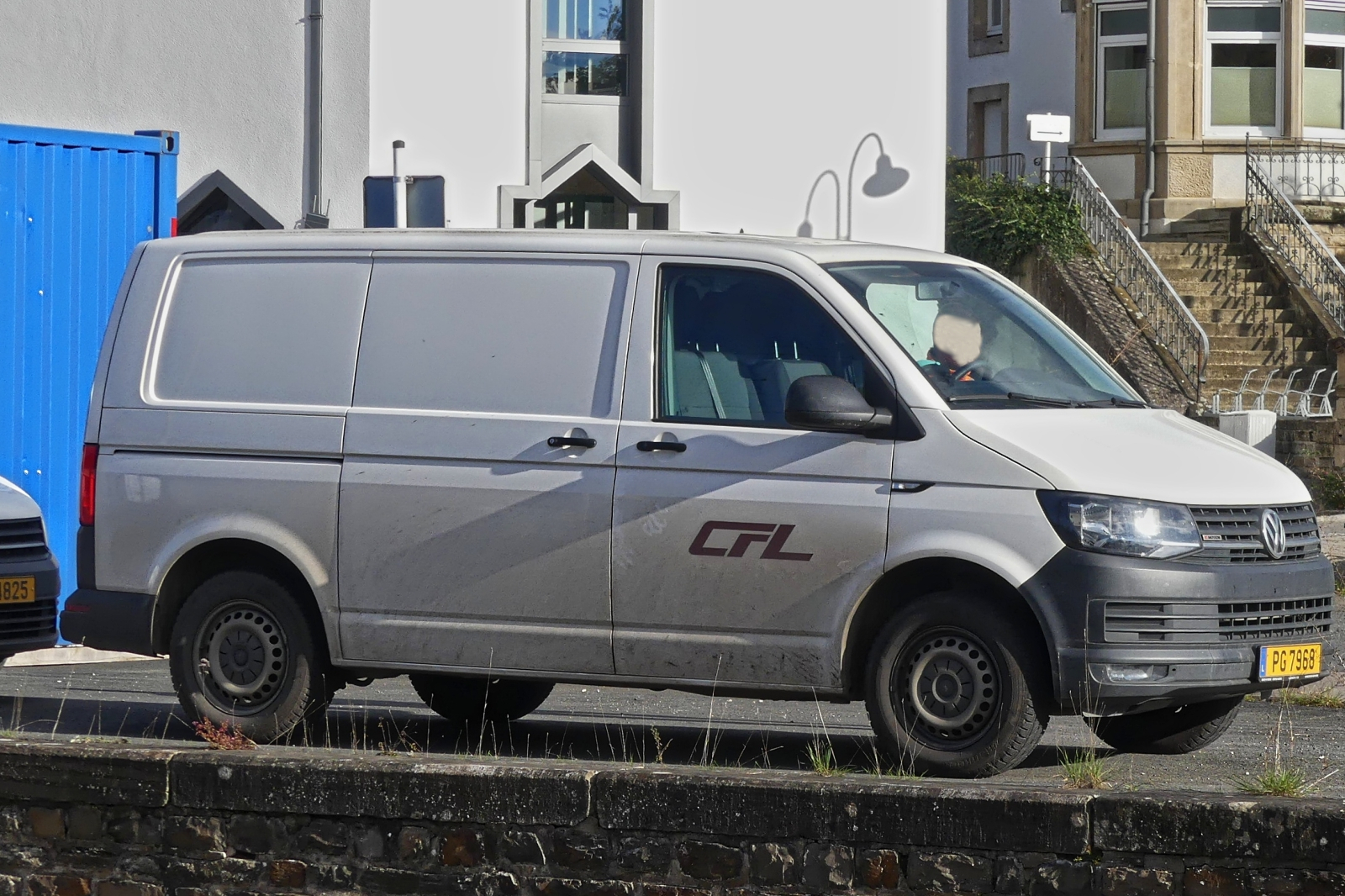 VW T6, vom CFL, steht etwas erhöht auf einer Plattform. 10.2024