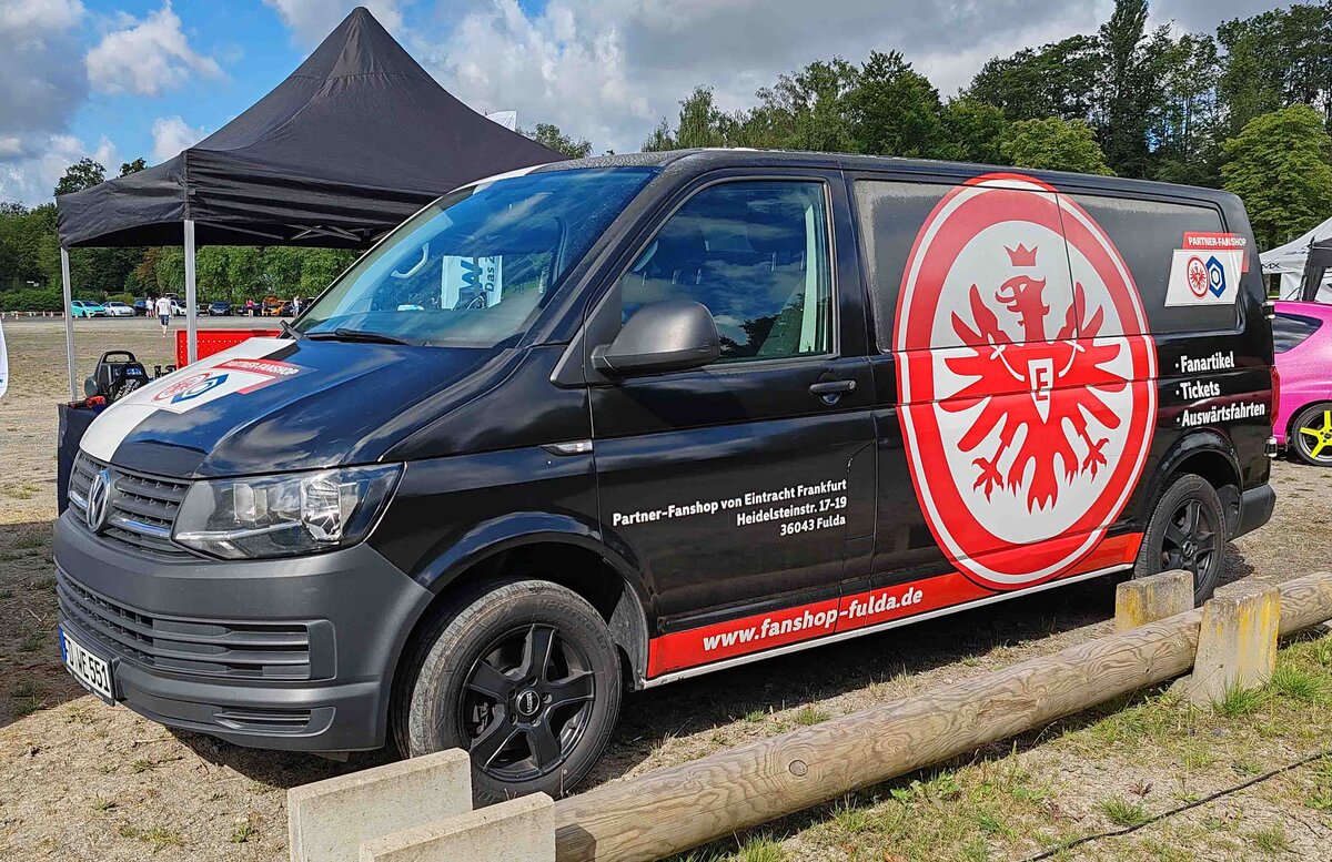 =VW T6 vom Fuldaer Fanshop EINTRACHT FRANKFURT, gesehen beim Automobiltreffen "TIEF AM TEICH" auf dem Hünfelder Festplatz im August 2024