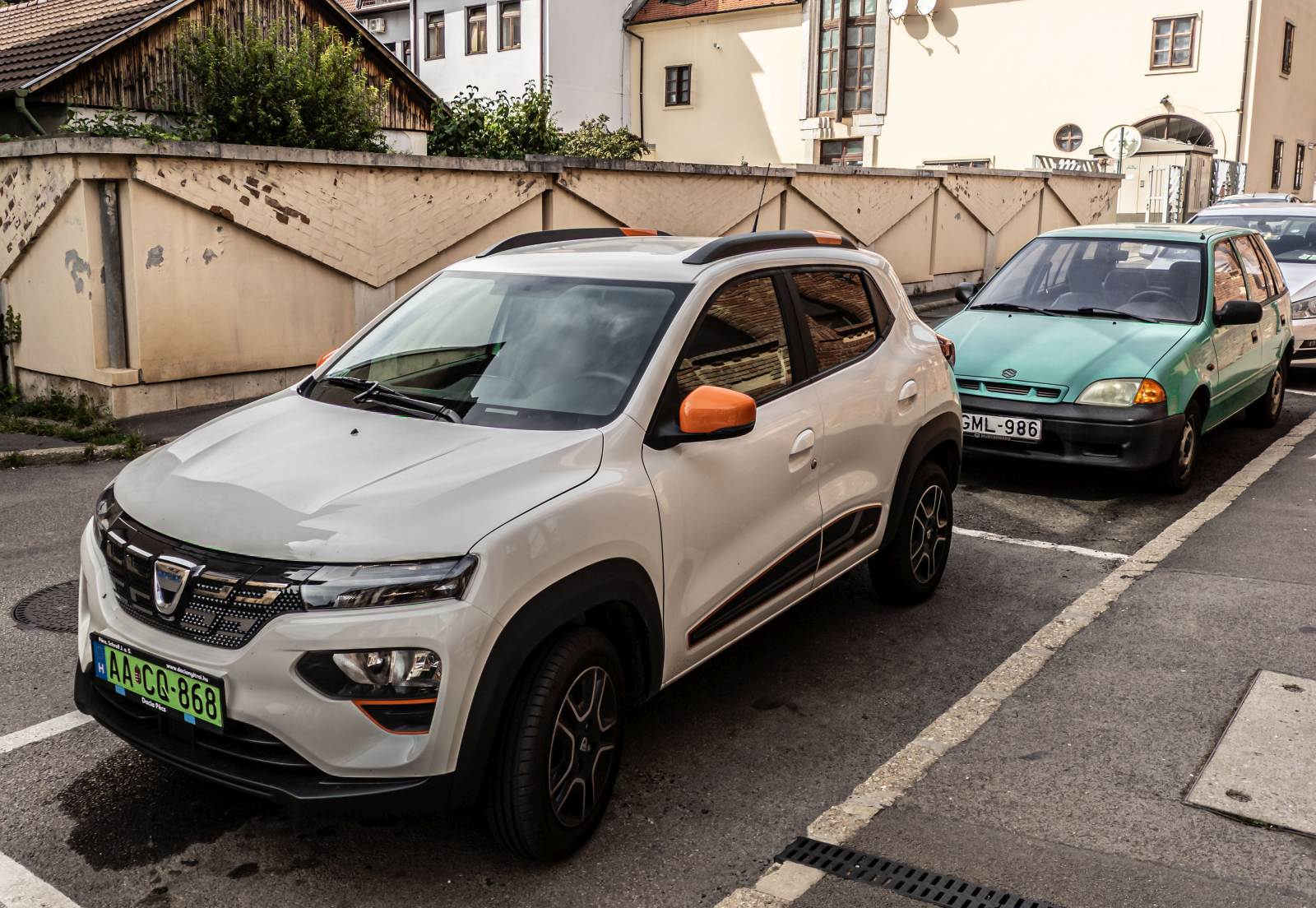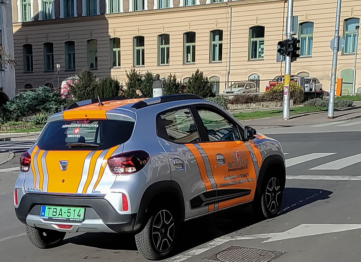 Rückansicht: Dacia Spring als Blut- Organ- und medizinische Warentransportauto. Foto: 03.2023. Der Spring ist ganz ganz optimal für diesen Zweck. Beschleunigt sich in der urbanen Umgebung ganz gut, ist klein und agil.