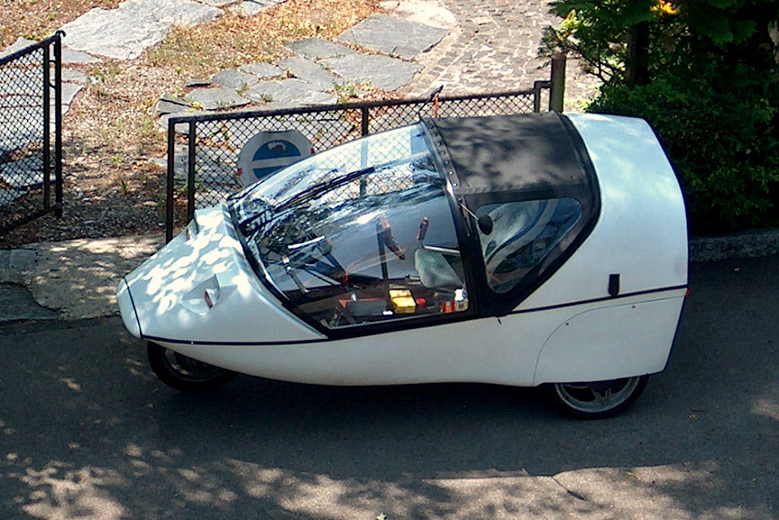 Twike, dreirädriges Leichtelektromobil mit Pedalantrieb für Fahrer und Beifahrer. Aufgenommen in Zürich am 30. Juli 2006