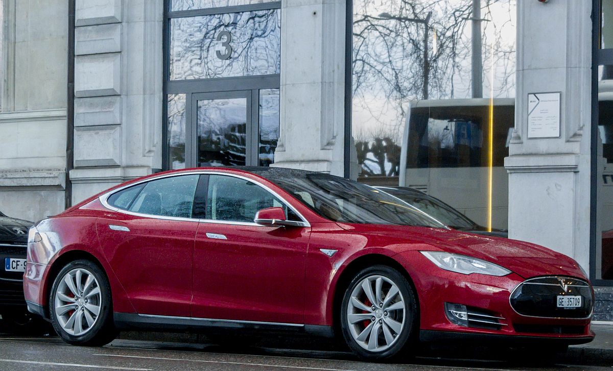 Roter Tesla am Strassenrand, aufgenommen am 03.03.2016.